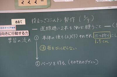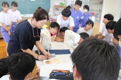 [4校時 2-2 家庭科]ボランティアの方にもご指導いただき、ミシン縫いの作業を行っていました。教頭先生の説明を、みんな真剣に聞いていました。