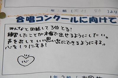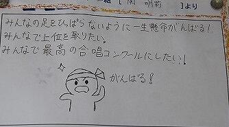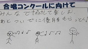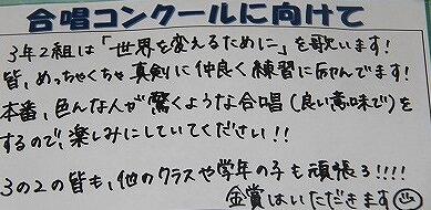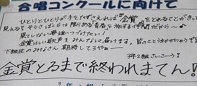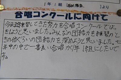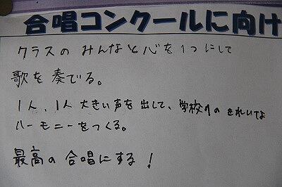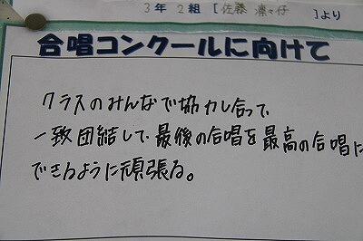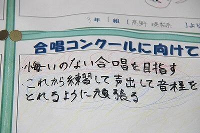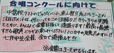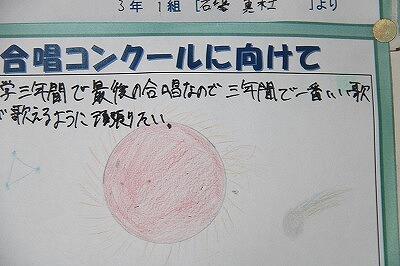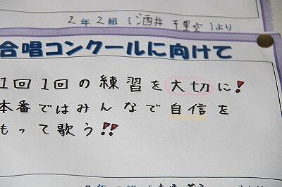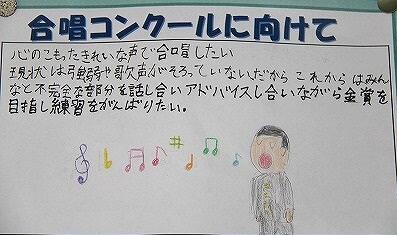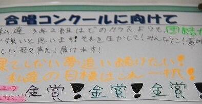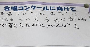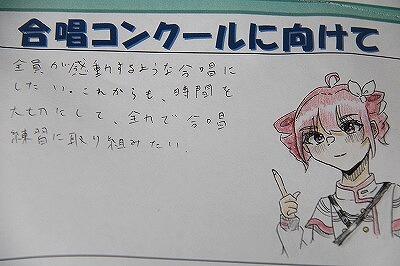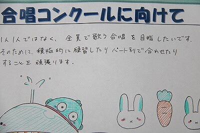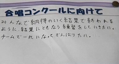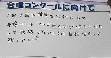 体育館への渡り廊下前の掲示板には、生徒たちの「合唱コンクールに向けた決意」が掲示してあります。今回はその一部をご紹介いたします!どのクラスも気合いが入っています!
