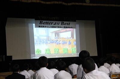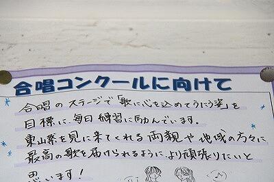 授業は集中、合唱は団結、準備は率先して。今日も東山祭に向けて、生徒&先生で合唱、準備をがんばりました。会場準備では、生徒が率先して活動してくれたおかげで、予定より早く終えることができました。保護者の皆様、地域の皆様、ぜひ会場に足を運んでくださり、生徒たちの躍動する姿を参観していただきたいと思います!