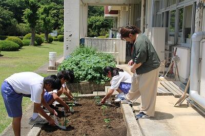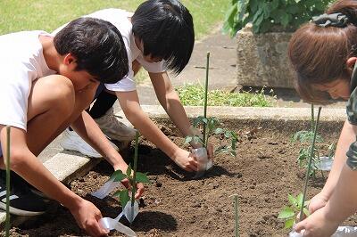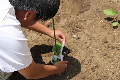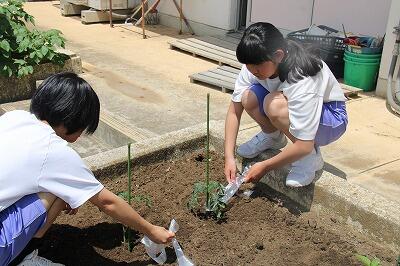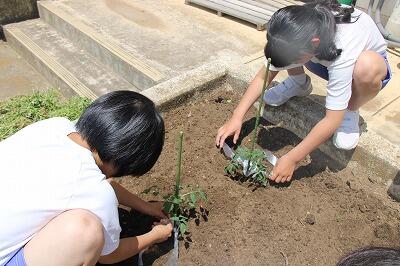3年3組では、ナスとピーマンとミニトマトの苗を植えました。収穫できる日が楽しみですね。