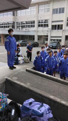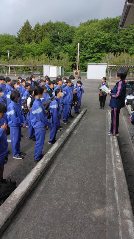 出発式では、教頭先生から宿泊学習の目的の確認、安全に2日間過ごせるようにすることなどお話がありました。代表生徒である実行委員長からも、楽しい2日間にできるよう呼びかけていました。最後に連絡事項として、那須の天候不順が懸念されるため、茶臼岳登山の中止が伝えられました。茶臼岳からの眼下に広がる雄大な景色が見られず、残念です。