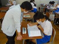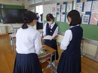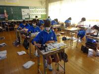 1校時の3年2組は、「人や物を紹介する言い方」についての授業でした。関係代名詞を使う非常に難しい内容でしたが、例文で文法を説明した後、自分たちで英作文を作ったりしていました。最後は、対戦ゲーム形式でお互いが作った英文クイズを行っていました。難しい内容でしたが、楽しそうにしていました。
