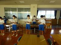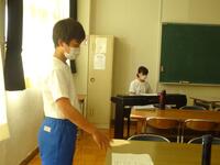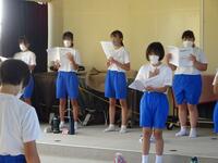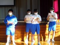 1学期の終業式が本日の4校時に行われました。コロナ禍と暑さのため、放送による終業式となりました。まずは校長先生の式辞がありました。式辞の中で、「目標を達成するためには、小さな目標の積み重ねが大切である」という話をされました。その後、各学年の代表による1学期の反省の発表がありました。3人の生徒達は、自分の作文を堂々と発表することができました。