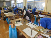 3校時、2年2組の美術の様子です。積極的に感じたことなどを発表していました。