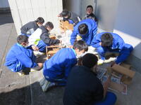 緊急放送をよく聞いて、できるだけ窓の少ない校舎1階に避難しました。避難態勢は「ダンゴムシの姿勢」です。壁側を向いて頭と首を守る姿勢です。