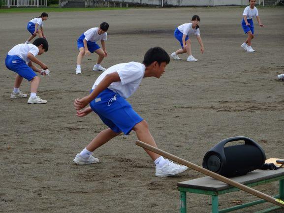 今日の体育の授業もソーラン節の練習から授業になります。学習指導員の先生が体育の授業の指導に入りました。生徒の模範にと一緒にソーラン節を踊りました。切れのある動きはさすがです。生徒たちもしっかりと練習していました。