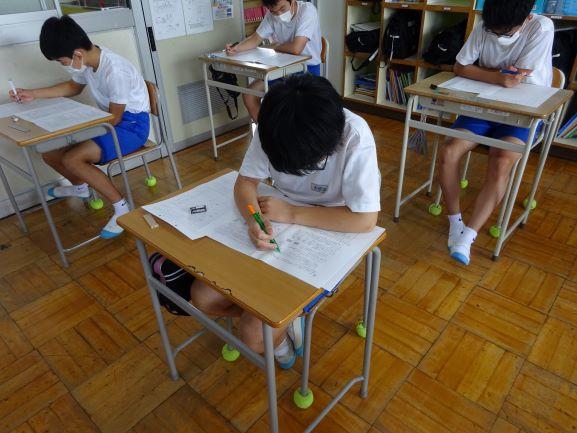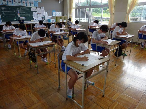 短い夏季休業が始まりましたが、3年生は第2回の校内テストを実施しました。生徒達は、休み時間も勉強するなど真剣に取り組む様子が見られました。明日から本格的に休みになります。計画的に学習に取り組んでほしいと思います。