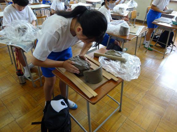 今日から8月6日(木)までの3日間、美術部が陶芸教室を実施しています。外部から陶芸講師を招き、町の陶芸展用の作品作りを開始しました。2・3年生は、慣れた手つきで作品作りを始めていました。1年生は、講師から説明を受けてから作品作りに入りました。みんな集中して取り組んでいました。3年生の中には、3年間同じテーマでつくっている生徒もいるなど、貴重な時間になっていました。