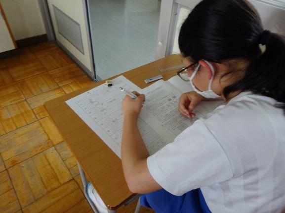 短い夏季休業が始まりましたが、3年生は第2回の校内テストを実施しました。生徒達は、休み時間も勉強するなど真剣に取り組む様子が見られました。明日から本格的に休みになります。計画的に学習に取り組んでほしいと思います。