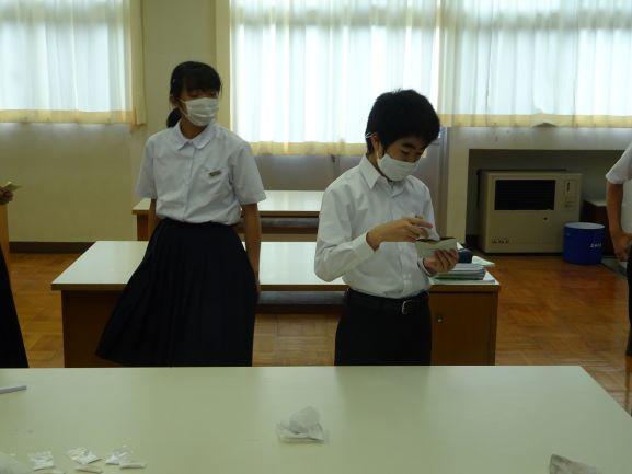 本日の2年生の理科の授業は、「酸化」の実験を行いました。密を避けるために、理科室と被服室に分かれて実験を行いました。使い捨てカイロの原理を学びました。鉄粉と活性炭素と食塩と水で簡単に作ることができます。生徒たちも実験に積極的に取り組んでいました。