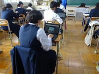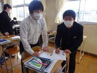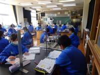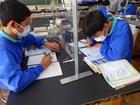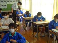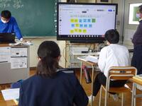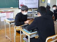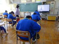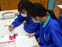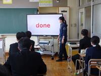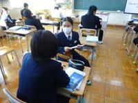 1校時の3年2組は、「人や物を紹介する言い方」についての授業でした。関係代名詞を使う非常に難しい内容でしたが、例文で文法を説明した後、自分たちで英作文を作ったりしていました。最後は、対戦ゲーム形式でお互いが作った英文クイズを行っていました。難しい内容でしたが、楽しそうにしていました。