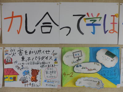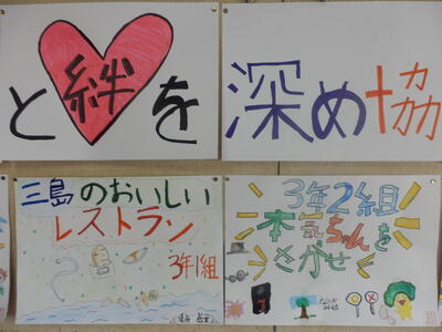 児童会役員さんが、渡り廊下にスローガンと各学級のポスターを掲示しました。