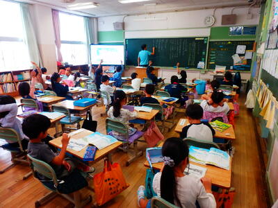 最初は読み聞かせ。大型絵本やペープサートに良い反応の1年生です。