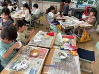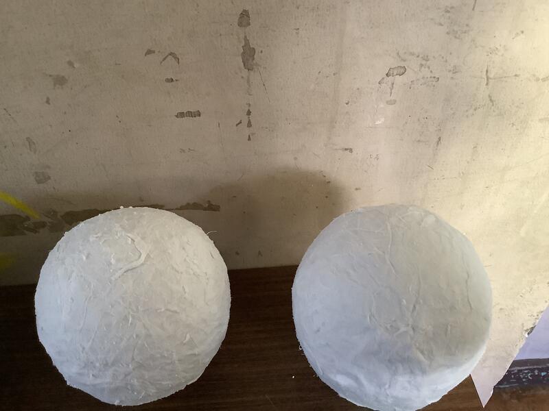 ヨーヨーを膨らませて、その周りに水溶きボンドでちぎった和紙を貼っていきます。