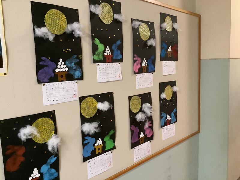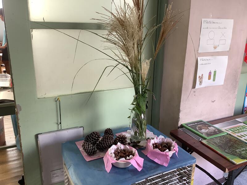 1年生の廊下には、松ぼっくりやどんぐりが供えられてました。
