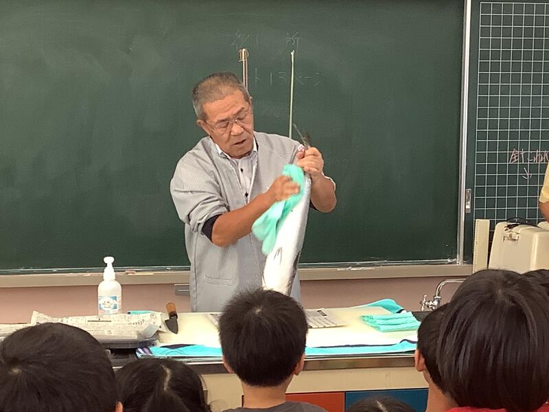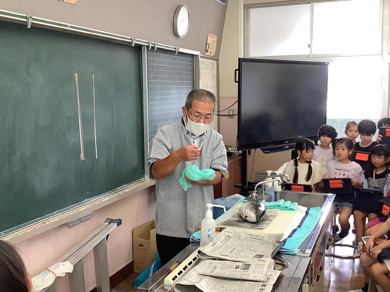 大きなブリをまるごと一匹持って、4階家庭科室にお魚授業へやってきてくださいました。