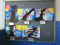 3年生のモチモチの木です。それぞれ個性が光っています。色の使い方がじょうずなので、月明かりや、勇気のある者だけが見る事の出来る「山の神の祭り」が浮き上がって見えるので驚きます。