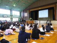 校長が来賓の紹介をした後、来賓を代表し三島市長様から御祝辞をいただきました。市長様も東小の卒業生です。子供達は真剣にお話を聞いていました。