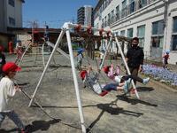 このところ天気も良く、気温も高いので子供達は元気に外で遊んでいます。1年生も先生について歩いていました。新しくできたブランコはやはり人気があります。