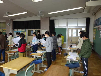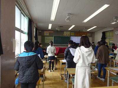 お弁当を食べ終わった5年生が、体育館に集合し、明日の卒業式の準備を開始しました。