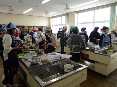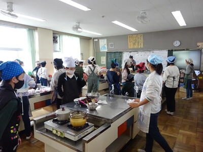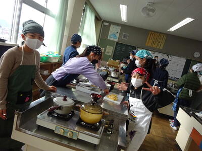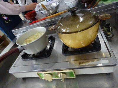 5年生が、味噌汁作りとお米の炊飯の調理実習中でした。