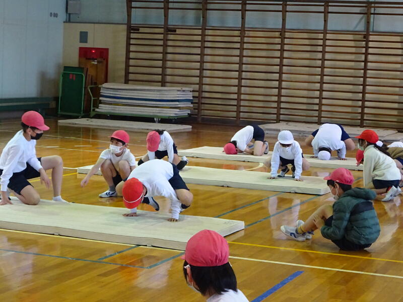 マットをセットした後は、二人ずつカエル逆立ちをやっていました。なかなか上手です。苦手な人は3つのコツがあるそうなので、確認してみてください。