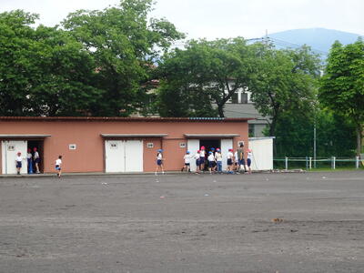 運動場では、ソフトボール投げと反復横跳びの記録をとります。