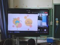 左)各教室の電子黒板には、オリジナル絵本の画像と交代で読み聞かせをしてくださっているボランティアの方が映っています。
