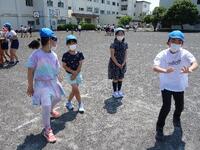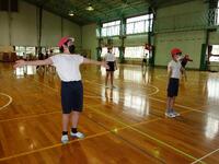 応援練習を見学している低学年児童も、体を動かしてマネしています。