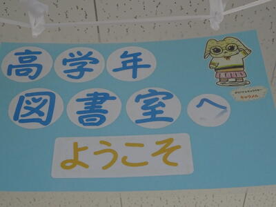高学年図書室前の表示が風で揺れて、「みんな来て来て。」と呼び掛けているようです。