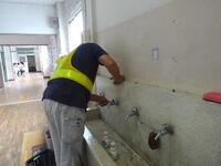 三島市指定上下水道工事店協同組合青年部の皆様による給水設備の点検奉仕作業を実施していただきました。北校舎2階の水道が出にくく困っていましたので、水を止めてから節水コマの調整、交換を行っていただきました。