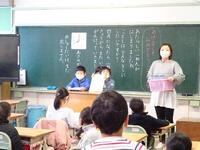 給食が終わった学年から、返却→選書→貸し出し手続きをします。ボランティアさんも来てくださり、会話がはずみます。新しくカードを作った子達は、大喜びでした。たくさんの本に触れてほしいです。