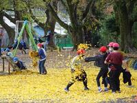 昼休みの運動場です。空が曇りはじめ、気温も低いですが、みんな元気いっぱいです。本気の木から落ちてくる黄色いイチョウの葉を集めて「落ち葉合戦」」をしていました。葉が舞い上がりきれいです。みんな大騒ぎでした。その横のバスケットコートでは、高学年がバスケを楽しんでいます。パスを回して軽快な動きでした。運動場の反対側ではドッジボールが白熱し、盛り上がっていました。グレーな空に東っ子の元気な声が響いていました。