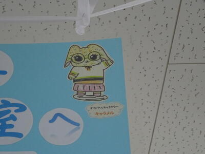 高学年図書室前の表示が風で揺れて、「みんな来て来て。」と呼び掛けているようです。