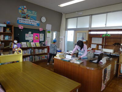 図書室内では、数人が短時間で本を選んで借りたり、返却したりしていました。