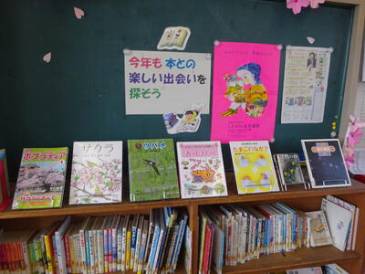季節に合った本のコーナーや子ども読書の日のポスター等があります。