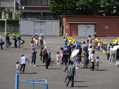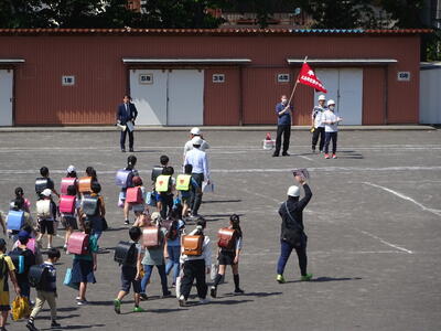 帰りの支度をして担任が誘導し、運動場に整列します。