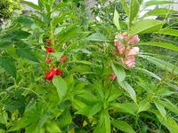 花壇のホウセンカ、畑のミニトマト、フェンスにつるを伸ばしているツルレイシ(苦瓜・ゴーヤ)。暑くてもたくましく花や実を付けています。