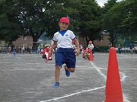 プログラムナンバー4。1年生の「まっすぐはしろう」です。1年生も力強い走りです。腕を大きく振って走ります。幼稚園よりも走る距離が長くなりました。