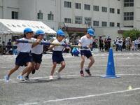 プログラムナンバー15。2年生の「学級対抗リレー」です。コーンを折り返すリレーですが、そのまわり方がとても上手です。スピードを落とさないで体を傾けながら回っていました。抜きつ抜かれつのレースでした。