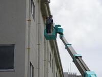 強い日差しの中、高所作業車に乗った業者の方が丁寧に調査をしています。