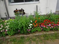 1年生の教室の前の花壇です。日当たりがいいのか、土がいいのかマリーゴールドの背が高いです。オレンジと黄色の花も大きいです。
