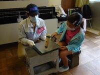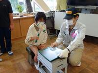 センサーとカメラが付いた模型の車の説明を受けたり、板金を木づちでたたいて加工する作業を体験したりしました。「みしまし」の文字の上をたたいての体験です。みんなとても上手です。