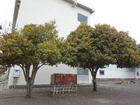 校庭の金木犀の花が咲き始め、白かった花が橙色(だいだいいろ)に色づきました。それと同時に甘い香りが広がっています。今日は曇空でしたが、橙色の花と香りで明るく感じる校庭でした。
