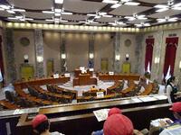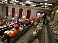 次は、県議会の本会議場の傍聴席に座り、お話を聞きました。「静岡県の1年間の予算を1万円札で積むと富士山の3倍の高さになる」というクイズに、みんな歓声をあげていました。