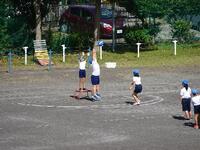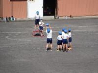 4年生は、運動場で台に乗った友達にパスする練習をしていました。台の前のディフェンスを上手に避けてゴールをするコツをつかんでいました。太陽がまぶしい天気の中、元気いっぱいでした。