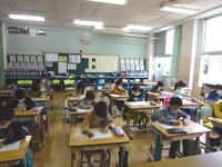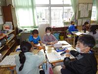 1年生がカタカナのプリントを一生懸命にやっていました。鉛筆の持ち方に気を付けて丁寧に書いています。「シとツ」「ソとン」等、似ている字、気を付けなくてはならない字が色々ありますが、みんな確かめながらしっかり書いていました。