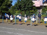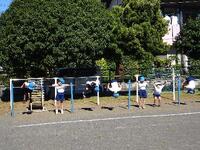 1年生は体育・鉄棒の授業です。担任の指示をよく聞いていました。一斉に「布団干し」の技に挑戦です。白い体育着の背中に太陽の光がふり注ぎ、まぶしいくらいでした。可愛いお布団が鉄棒に並んで、ほほえましい光景でした。