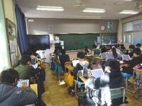 6年生の教室です。国語の授業で意見文を書いていました。その後、短歌を考えます。タブレットを活用して、自分で推敲しながら完成を目指していました。どんな意見文・短歌ができたのか気になります。