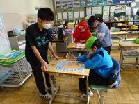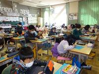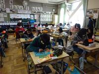 4年生の図工です。彫刻刀を使って、板に書いた顔を掘り進めていました。みんな版木と彫刻刀の刃先を見ながら作業をしています。個性の光る作品が仕上がりそうで楽しみです。